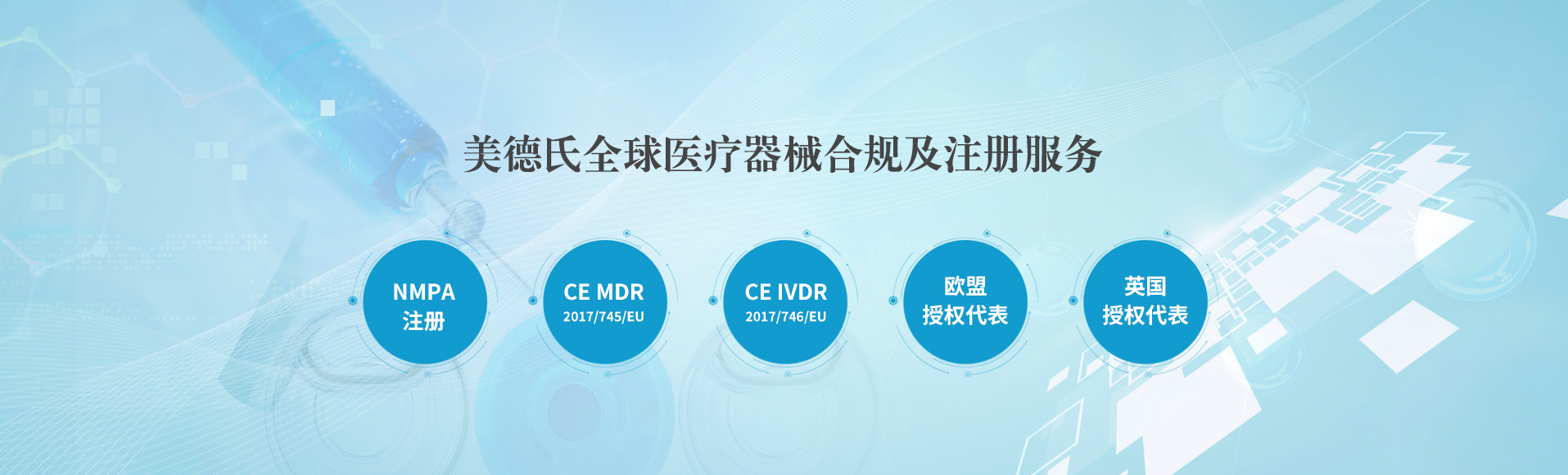上海美德氏醫(yī)療科技有限公司觸及醫(yī)療行業(yè)熱點需求,提供專業(yè)法規(guī)解讀,專業(yè),誠信,可靠,真正為您的醫(yī)療產品出口的合規(guī)環(huán)節(jié)提供全流程解決方案! 美德氏涉及的服務包括醫(yī)療器械歐盟CE認證咨詢(mdr認證;IVDR認證),ISO 13485咨詢;美國FDA注冊(510K;QSR820);歐代美代;國內NMPA注冊咨詢:醫(yī)療器械歐...